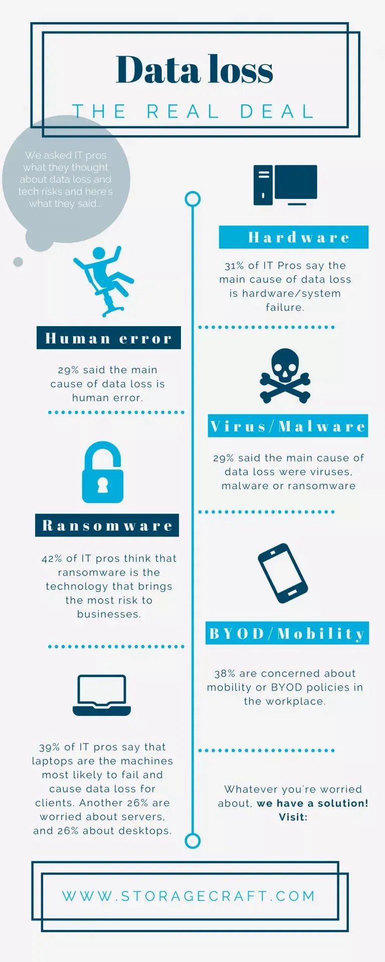 IT professionals are most commonly concerned about ransomware and mobility (BYOD policies), according to a recent StorageCraft survey. Forty-two percent of IT professionals believe that ransomware is the technology that brings the most risk. Another 38 percent are concerned about mobility and BYOD policies, shows the survey. Hardware/system failure and human error are the most common causes of data loss, according to the poll. Read below to see some eye-opening data loss statistics.